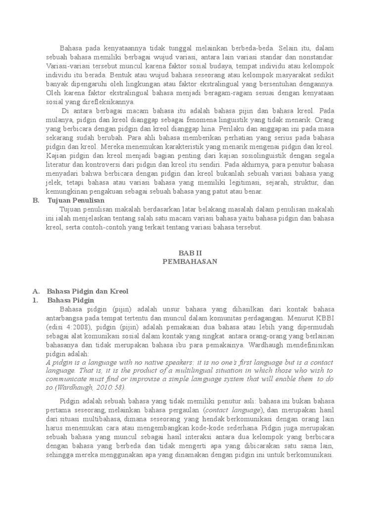 Selain itu, akibat kontak bahasa. Sebagai contoh, ketika dua kelompok wisatawan yang sedang. Pidgin bisa menjadi kreol ketika adanya penutur asing dan digunakan oleh keturunannya yang kemudian dibekukan sebagai bahasa pertama mereka. Contoh bahasa pijin inggris melanesia seperti dipaparkan l. Bahasa melayu pasar masih dipakai dengan lingkup terbatas di singapura dan malaysia.